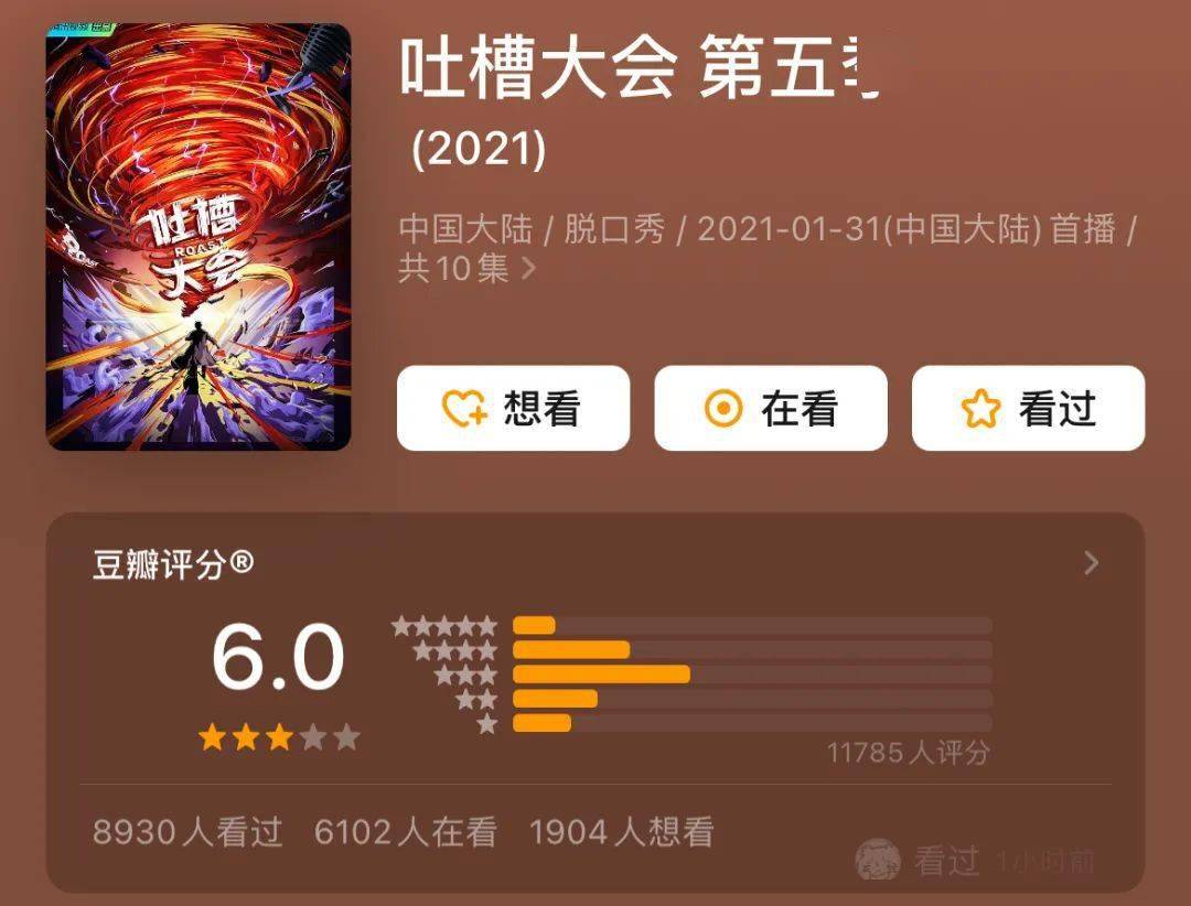 五年以来,《吐槽大会》的豆瓣评分持续下滑,行至第五季,已经来到了6.0分的及格线边缘。曾经,让观众眼前一亮,感慨吐槽还能这么玩、明星还能被这样“埋汰”的《吐槽大会》,渐渐变成一档了“没心没肺看才会觉得好笑”的节目。