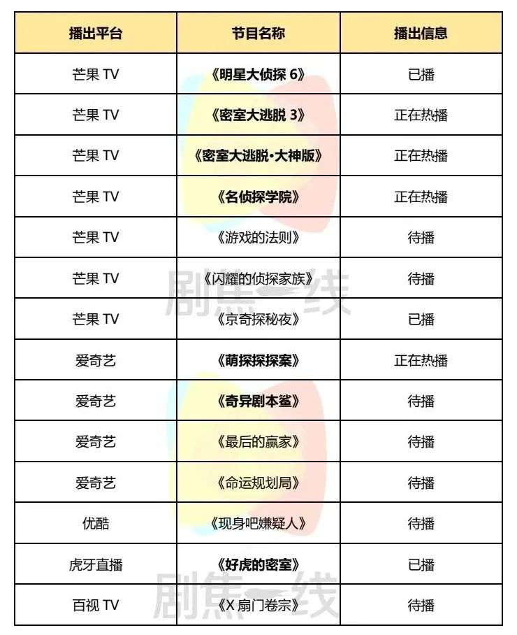 在众多推理综艺中,芒果tv盒子工作室布局较早,由其制作的《明星大侦探》与《密室大逃脱》,分别作为国内角色扮演推理节目和密室逃脱推理节目的老牌选手,在一众新秀节目中拥有较为稳定的观众缘。这两个节目也分别衍生出了《名侦探学院》和《密室大逃脱·大神版》。前者从为“明侦”选拔侦探助理发展而来,逐渐也自成体系;后者大神版原本作为节目组测评内容,制作成衍生节目后,颇受观众喜爱,被反复作为二创素材。