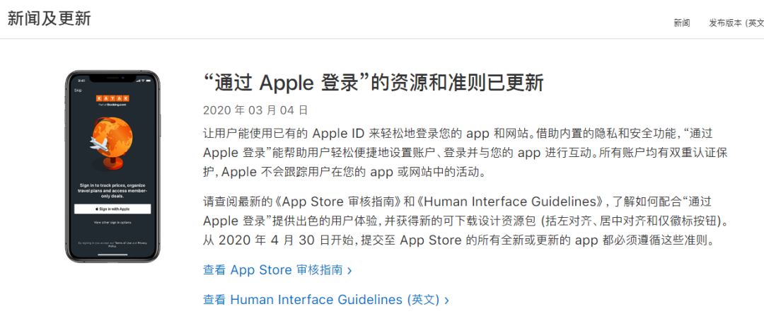 注意:此次,苹果不仅在《App Store 审核指南》条款 4.8 Sign in with Apple 中明确表示,开发者需要在 App 登录界面增加通过 Apple 登录的方式,同时也另更新了《Human Interface Guidelines》页面,帮助开发者以更佳、更全面的方式为用户设置通过 Apple 登录。