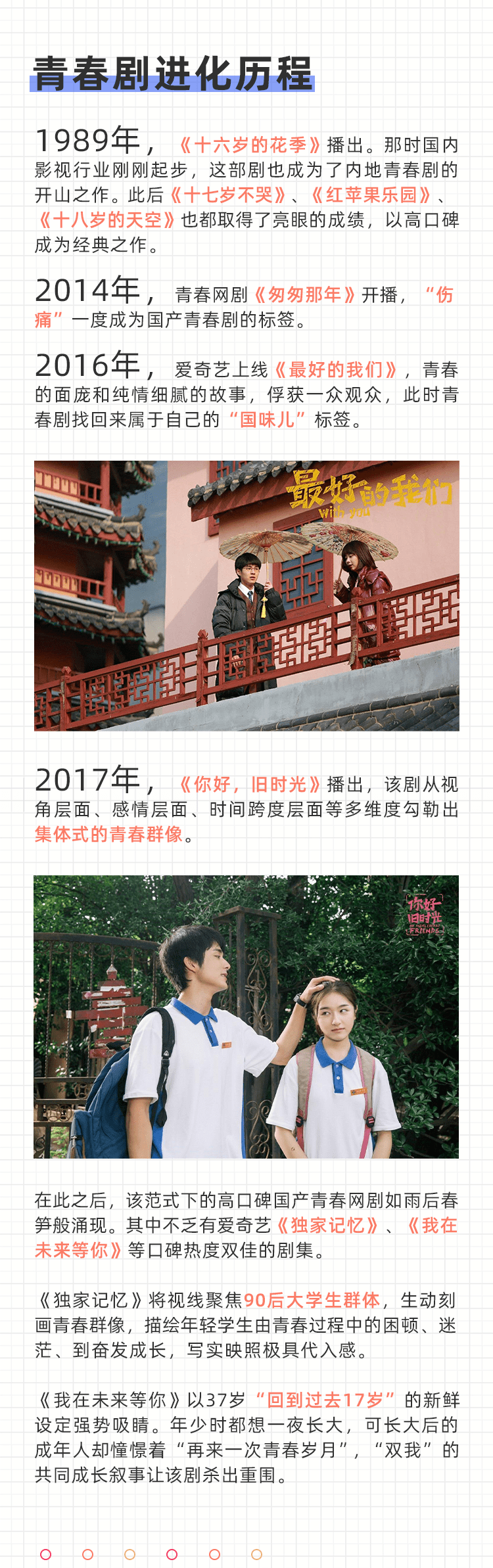 无论在什么样的年代,青春剧都承载着一代人的 青春情怀。随着和各类元素的不断碰撞,青春剧也在不断进化,但始终不变的,是那份永远鲜活,永不褪色的青春记忆。