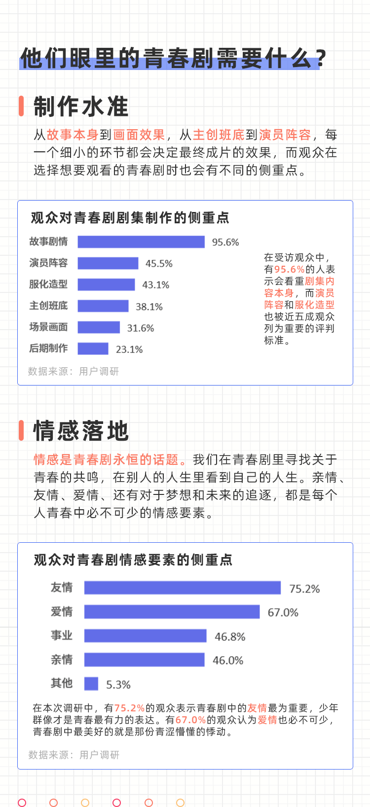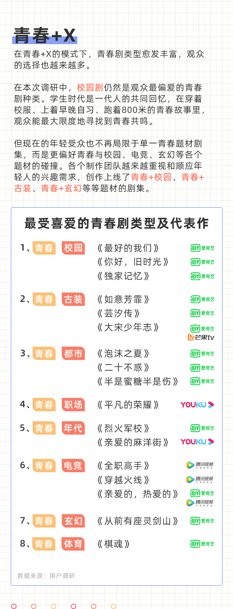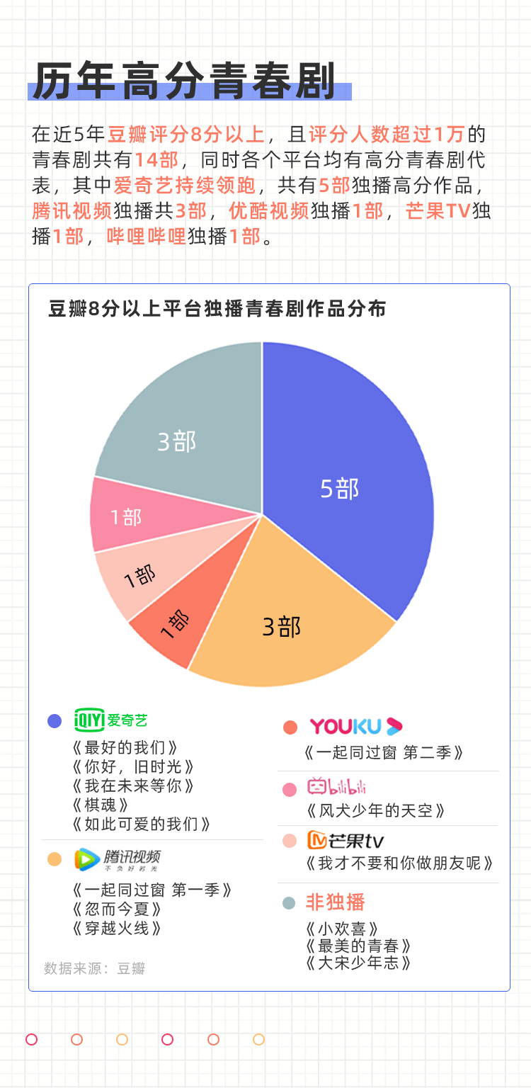 从用户调研到青春题材市场分析,可以看出视频平台在青春剧进阶过程中占据了重要位置。而其中爱奇艺在该题材中的探索最多,市场表现优异,具备较强的案例性。以爱奇艺为例,我们研究了高热度高口碑青春剧到底需要具备哪些特质。