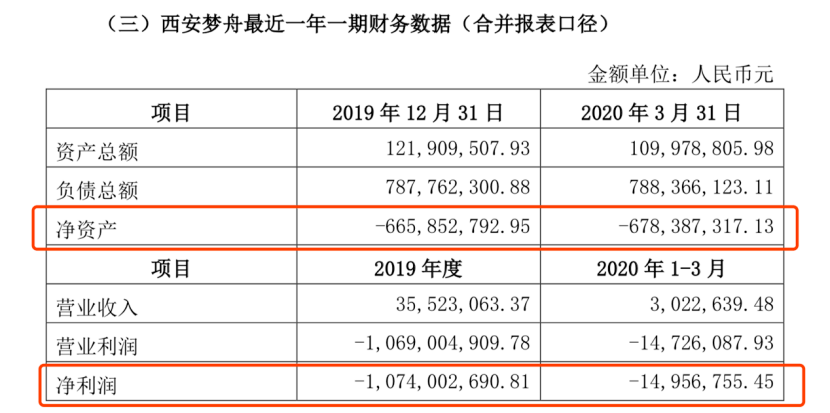截至2019年12月31日、2020年3月31日,西安梦舟的合并净资产均为负数,分别为-6.66亿元和-6.78亿元;2019年度及2020年1—3月,公司合并净利润均为负数,分别为-10.74亿元和-1495.68万元。
