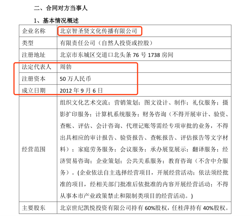 工商资料显示,北京智圣贤成立于2012年9月6日,注册资本50万元,法定代表人周勃。经营范围包括组织文化艺术交流,营销策划,图文设计、制作,礼仪服务,摄影扩印服务等。