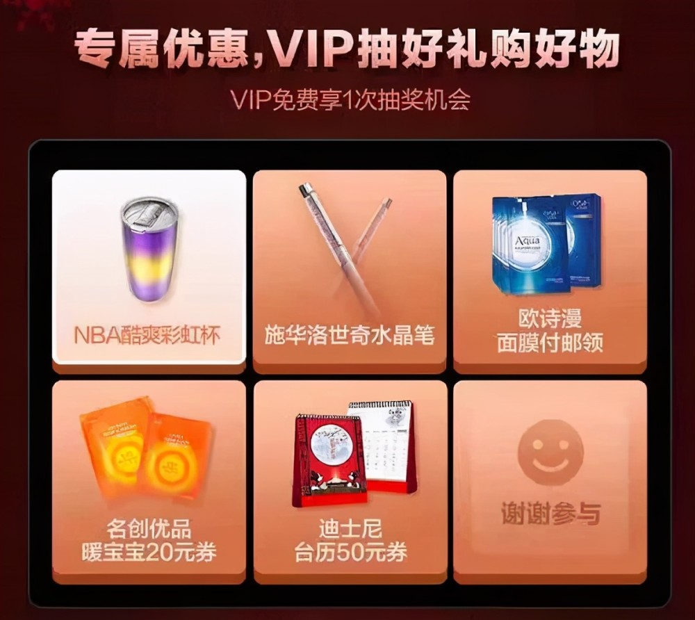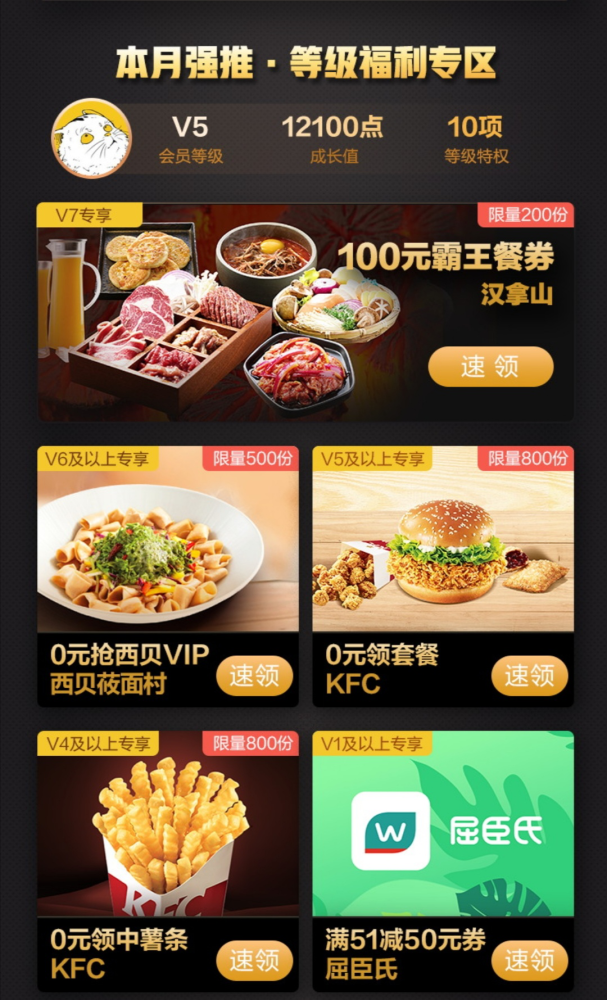当然,更多的福利类型是面向所有会员的,包括了0元秒抢、速抽好礼、福利精选等,所有的福利礼物都是严选好物,比如星巴克马克杯、屈臣氏、哈根达斯、汉拿山、KFC等,这些权益满足了用户对品质生活的精细需求。