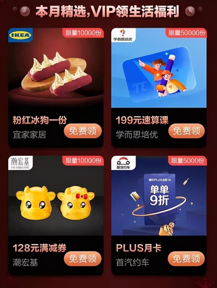 VIP会员福利甚至还能为用户提供社交货币。活动中,会员可以邀请朋友抢福利,甚至获得的优惠券还能分享使用,具备一定的社交价值。另外,裂变传播也在无形中,让福利覆盖了更广大的参与人群。