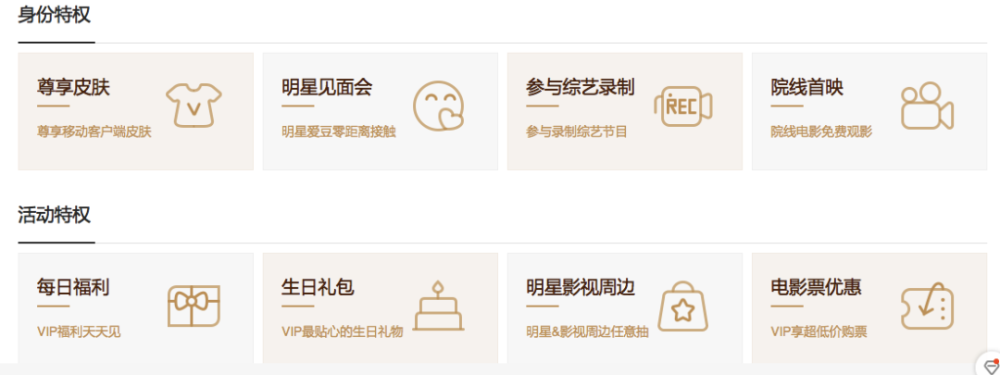 可以看到,在这一服务体系之中,会员权利与等级有很大关联,VIP会员甚至还能通过“热剧抢先看”、“与明星面对面”等专属性权益,获得差异化的身份感。福利差异一方面会引导用户关注自己的会员等级成长体系,另一方面,也能从成长设定中获得沉浸感。