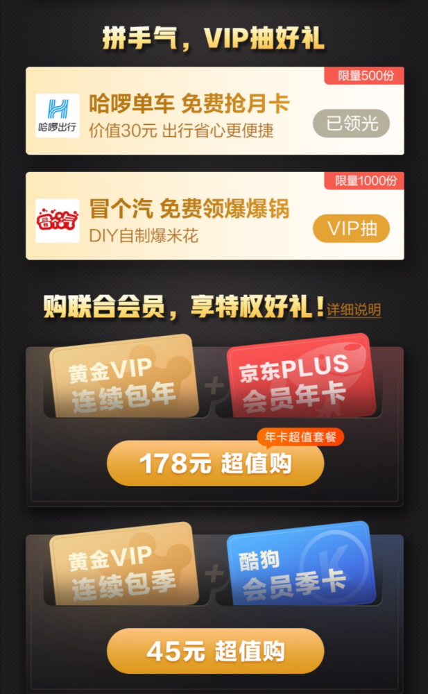 有趣的是,如果我们仔细分析这些福利类型,便能看到福利背后对应的价值落点。对于新用户,这天会推出价格非常优惠的联名会员。比如178元/218元的黄金VIP连续包年,赠京东PLUS会员年卡;另一种是45元/58元的黄金VIP连续包季,还附赠酷狗季卡会员。对于高级会员(V3-V7),这天会推出对于不同等级用户的不同等级福利,等级越高,福利种类越多、力度越大。