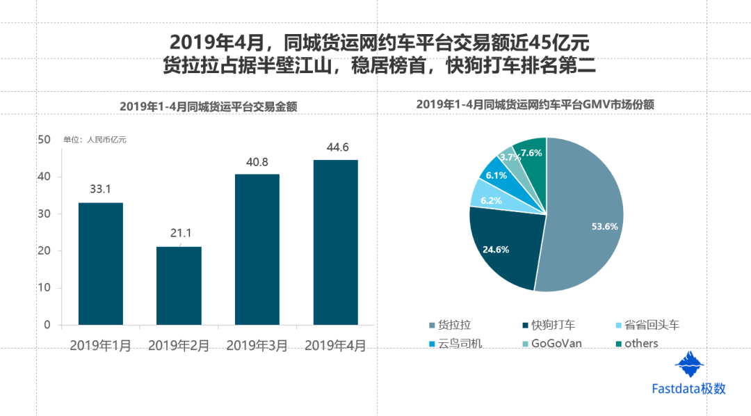 根据Fastdata发布的《2019年上半年中国同城货运网约车趋势报告》,2019年1-4月里,货拉拉的市场份额达到53.6%,第二名快狗打车为24.6%,互联网同城货运“一超一强”的格局已经形成。