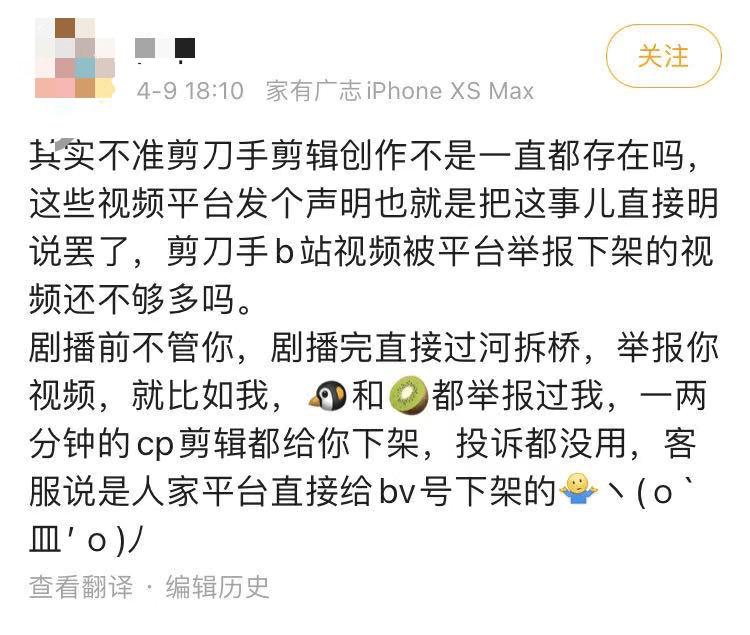 可是在《声明》之下,视频平台对于剧集内容版权进行了收拢,这些作品能够持续产出就需要画上问号。对于一部分剪辑爱好者们而言,《声明》的出现带着“一刀切”的蛮横。“我熬夜爆肝产粮,就是出于喜爱想要做点什么,分享自己的快乐,自来水,视频虽然不一定剪得特别好,但也都是我用心创作的。现在觉得很无力。”