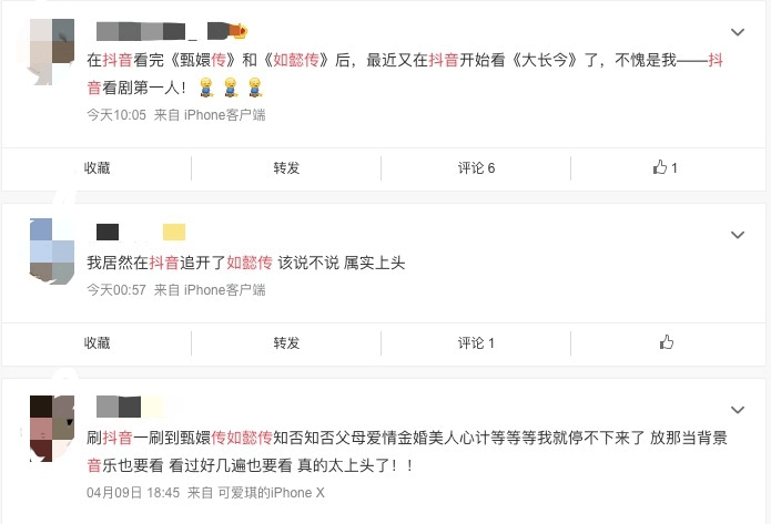 而在这种情况下,长视频平台高成本、高投入的长视频内容就显得转化力低下,成为了“他人的嫁衣”, 短视频平台截获了长视频内容的用户流量与传播热度,并完成了内化。这种转化还不止针对在播热门剧集,还包括已经完结的经典剧集。“我是在抖音上看完《甄嬛传》《如懿传》的。”