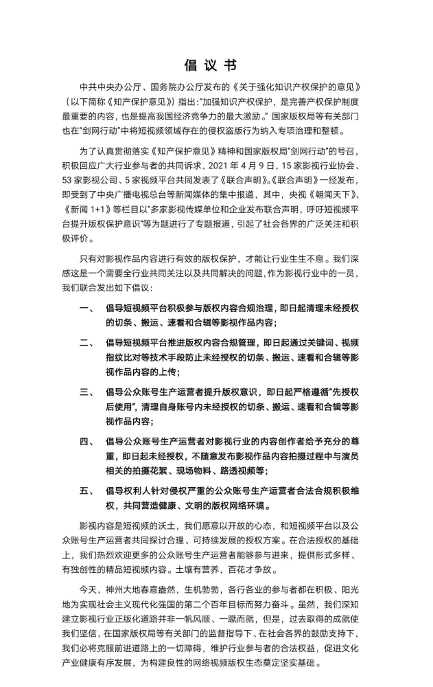 继4月9日73家影视机构发布《联合声明》之后,4月24日,73家影视机构再度发布《倡议书》,明确《关于强化知识产权保护的意见》对声明和倡议书的指导意义的同时,进一步将短视频平台、公共账号的生产运营者明确为责任主体,时隔半个月后的发声也在多个层面变得更加具体。