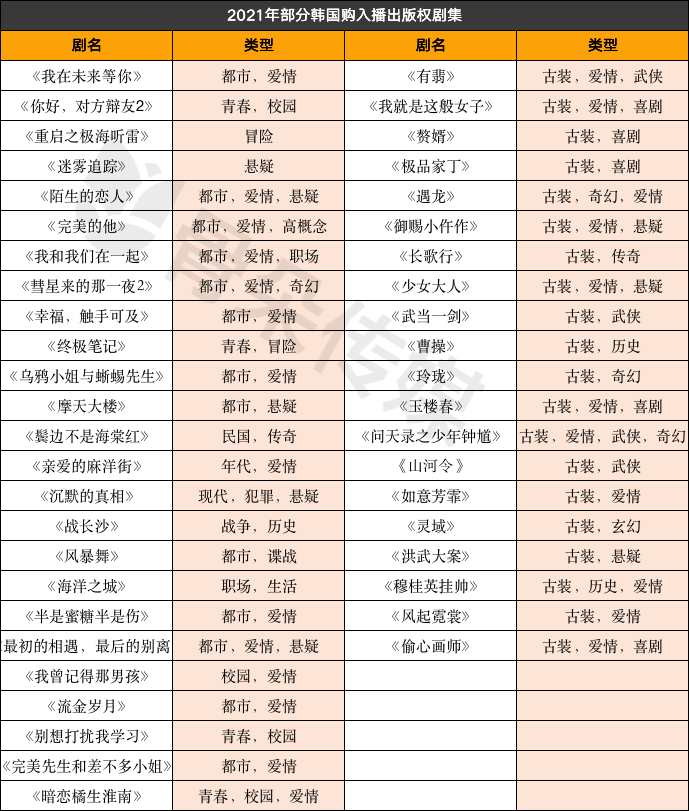 在2021年部分韩国购入播出版权的剧集中,古装类型的剧集占据半壁江山。