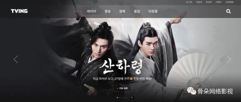 然而《山河令》的“排面”远超预期。同属CJ集团旗下的韩国流媒体平台TVING首先加入了《山河令》的网播阵容,韩国流媒体平台前列的WATCHA也随后加入。播出之前,TVING甚至将官网的首屏设置为《山河令》海报,并打出“从直播到彩蛋甚至特辑,我们都有”的宣传口号争取观众的青睐。