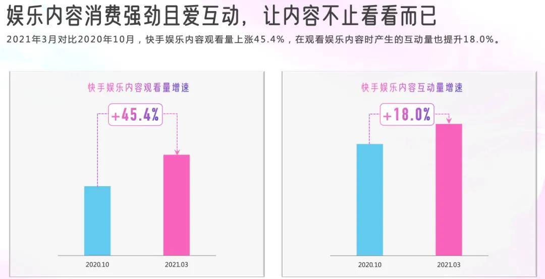 《报告》统计称,2021年3月对比2020年10月,快手娱乐内容观看量上涨45.4%,互动量提升18.0%。其中,影视内容播放量增336%,平均互动量增443%;电视剧相关内容观看量增70倍,点赞量增40倍;近半年综艺内容搜索量增59.8%,互动量增58%。