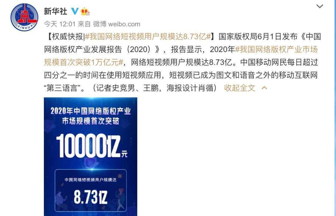 这是最新的中国网络短视频用户规模数据,出自国家版权局6月1日发布的《中国网络版权产业发展报告(2020)》。基于此数据,新华社在当天报道中评述道,“短视频已成为图文和语音之外的移动互联网‘第三语言’”。