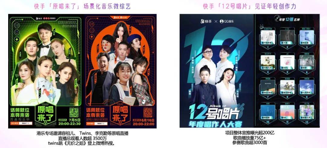 而借助“音乐可视化”的特性,短视频平台正构建起全新的音乐泛娱乐社交生态。一方面,短视频可打通线上线下,把音乐节、livehouse、演唱会搬到直播间,如快手曾携手迷笛音乐节独家直播20年生日会,直播讯息覆盖400个摇滚核心社群;场景化音乐微综《原唱来了》则邀请容祖儿、Twins、李克勤直播代表歌曲演绎,总观看人数超 3500万。