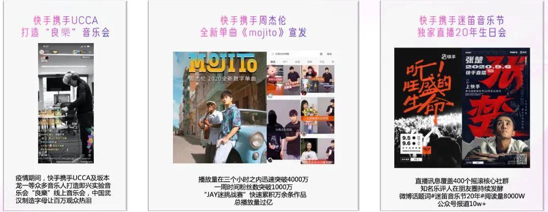 因听者众,短视频逐渐演化为“发歌平台”,这也意味着,短视频正在抢夺原本应由唱片公司做的事情。周杰伦去年新曲《mojito》的最大发行亮点是联合快手,《报告》透露,该歌曲播放量三小时内破了4000万,#JAY迷挑战赛#累积万余条二创作品,禁毒版《Mojito》广受好评,助力歌曲在高线城市、下沉市场的全渗透传播。