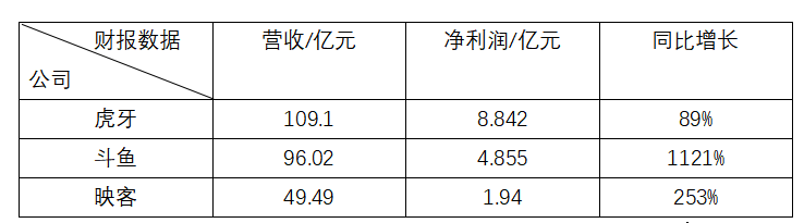 参照各公司财报,虎牙2020年营收为109.1亿元,净利润达8.842亿元,同比增长89%;斗鱼2020年营收为96.02亿元,净利润达4.855亿元,同比增长1121%;映客2020年营收为49.49亿元,净利润达1.94亿元,同比增长253%。