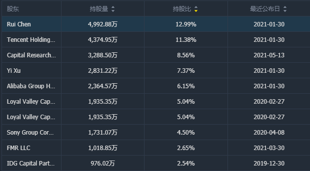 B站持股比例排名前十的股东 来源:Tiger Trade