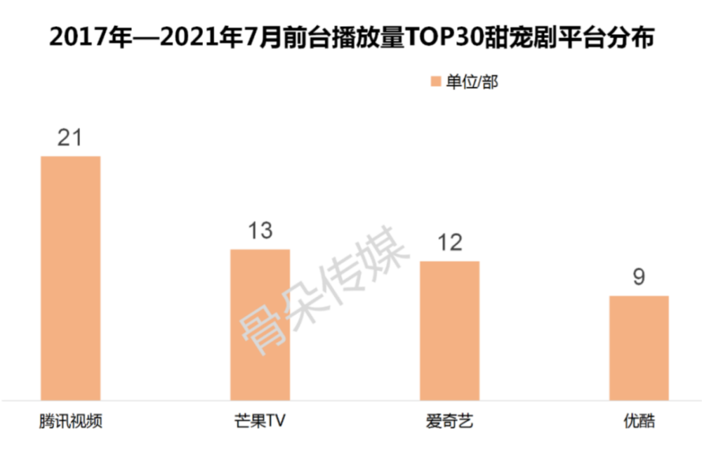 在盘点近五年骨朵播放量前30名的甜宠剧时,骨朵发现,四大平台中播放量最高的是腾讯视频,接着依次是芒果TV和爱奇艺。