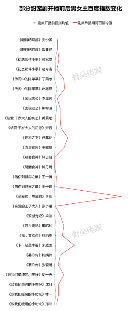 而从艺人红利来看,从17年甜宠剧兴起,首先从甜宠剧中冒头的演员邢昭林、胡一天等演员因此走红,在当时取得了不低的热度;18年流量演员入局,带动王鹤棣、黄景瑜、宋茜、鞠婧祎等演员的热度;19年甜宠剧数量大爆发,但是除了几部头部作品助力林一、李现、赖冠霖等演员热度高涨之外,其他的演员都没有因此获得太大的红利;20年甜宠剧的长尾效应仍在,宋威龙、任嘉伦、丁禹锡、赵露思等演员或因为CP感、或因为人设魅力热度上涨。