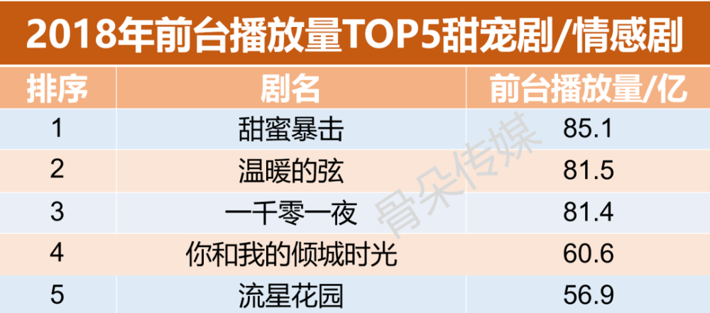 据观察,18年上榜的甜宠元素剧可分为两大类。其一是有知名流量演员坐镇的剧集,如鹿晗主演的《甜蜜暴击》、迪丽热巴邓伦主演的《一千零一夜》、赵丽颖主演的《你和我的倾城时光》等;其二是挂靠知名IP创作的剧集,如《温暖的弦》《流星花园》《芸汐传》《结爱·千岁大人的初恋》等。
