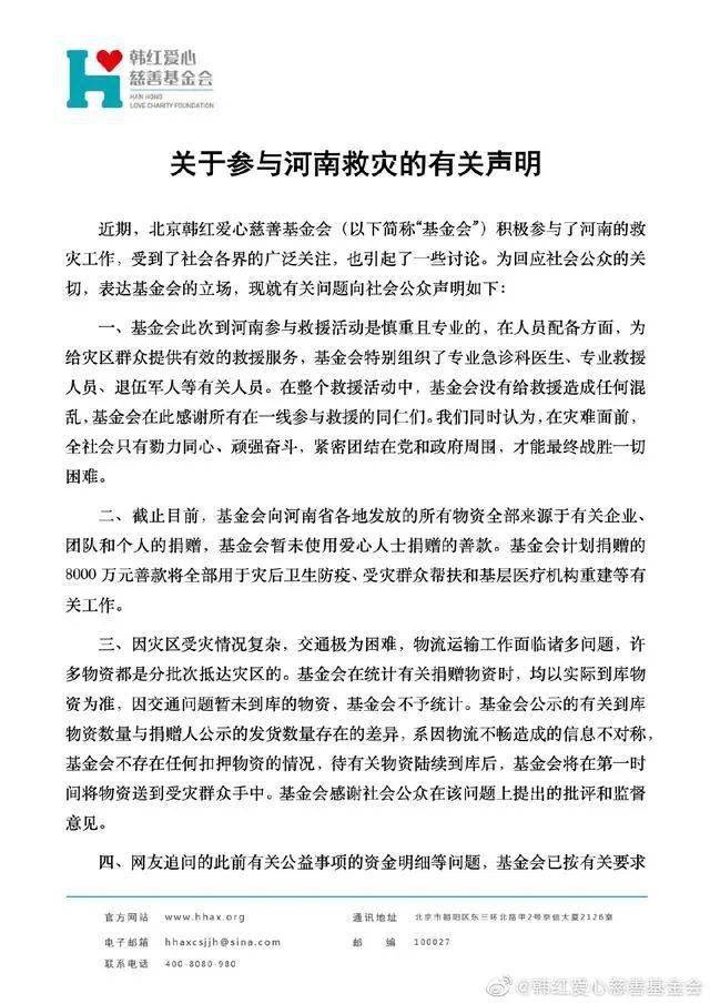 7 月 26 日,韩红爱心慈善基金会就参与河南救灾发表声明。