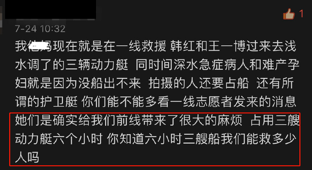 7月24日,新乡一线地区的人发文爆料,王一博和韩红过来后,调了三辆动力艇走,当时有急救病人和孕妇需要船,却被他们占用了三艘动力艇六个小时,他们知道六个小时,我们要救多少人吗?