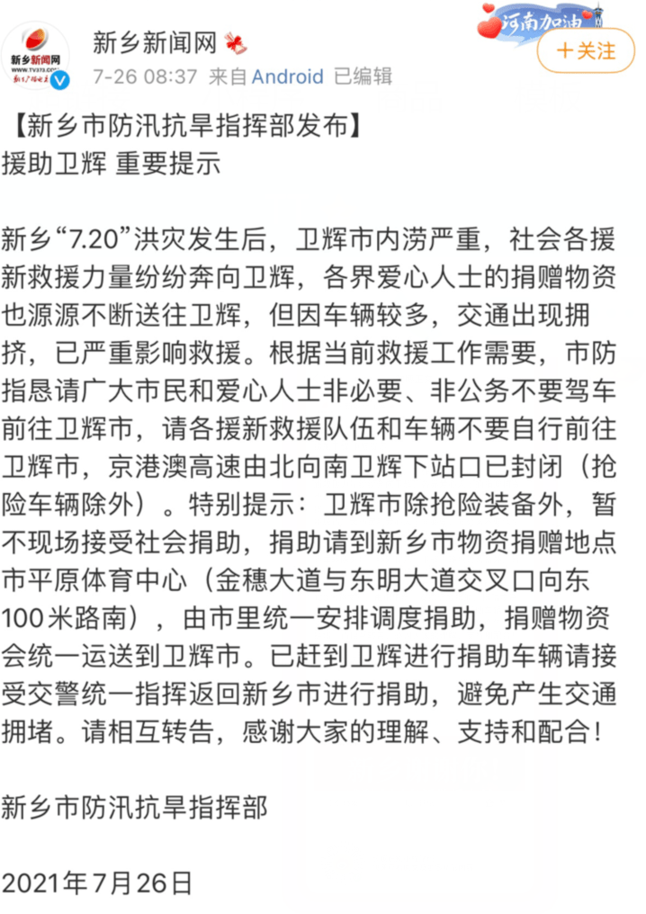 据新乡新闻网,7月26日,新乡市防汛抗旱指挥部发布援助卫辉重要提示: