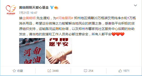 物资方面,黄晓明捐赠20万瓶饮用水和1万瓶消杀用品;黄子韬下架旗下服装品牌“YKYB”所有衣服,全部支援河南灾区。