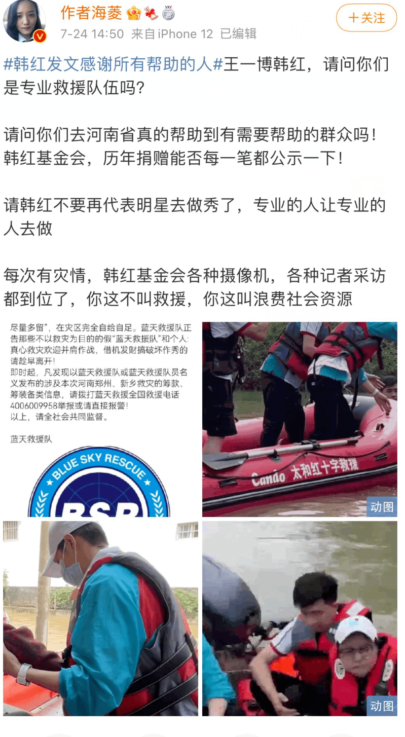7月24日,@作者海菱发文公开质疑韩红与王一博的灾区行是为了作秀而不是救灾。