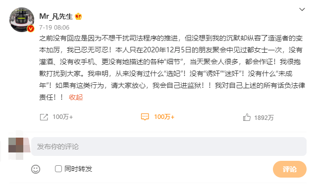 至今,吴亦凡微博的最近一条动态还停留在7月19日其对都美竹爆料内容的回应上,雷达财经注意到,该条微博转发、评论量均在100万+,点赞量为1892万。这段话曾被一众吴亦凡粉丝——梅格妮们奉为吴亦凡清白的铁证。