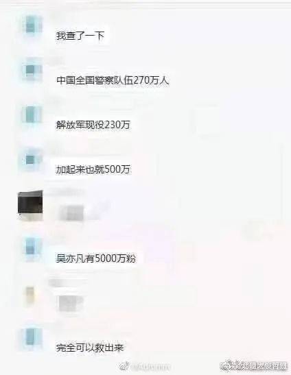 据瞭望东方周刊报道,脑残重症粉丝群中有人说“吴亦凡有5000万粉丝,解放军和警察队伍加起来也就500万,完全可以救出来”的。