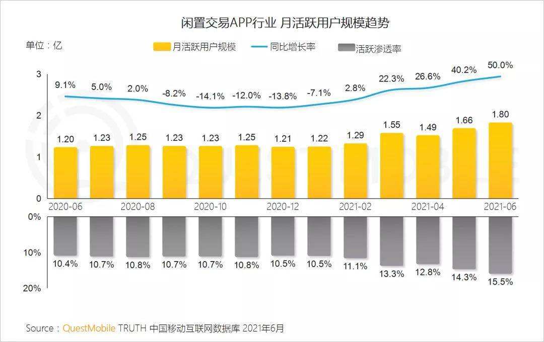 据MobData研究院数据,2020年,国内二手闲置流转规模已达万亿,具体交易额较2018年上涨了5120亿,达12540亿。与之呼应,QuestMobile《中国移动互联网2021半年大报告》显示,截止今年6月,闲置交易App行业的月活跃用户规模同比暴涨50%,达到创新高的1.8亿人次,活跃渗透率也从一年前的10.4%增长到了15.5%。
