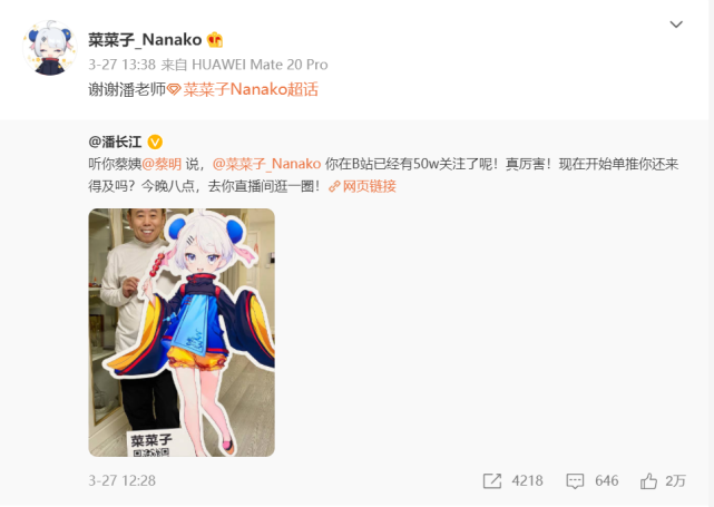 不仅年轻人可以做虚拟艺人,事实上老艺术家蔡明老师就以“菜菜子nanako”的虚拟身份,在B站上再次出道,令大众直呼惊喜。去年6月,菜菜子的B站直播,开播仅25分钟就登上了B站直播人气榜第一,最终人气值突破了600万,并喜提热搜前五。