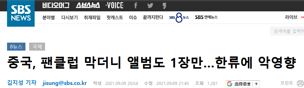 SBS:中国让粉丝只许买一张专辑……对韩流产生负面影响