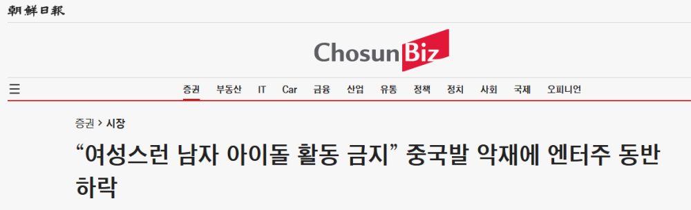 朝鲜日报:“杜绝‘娘炮’” 受到来自中国的不利因素影响,娱乐股同时下跌