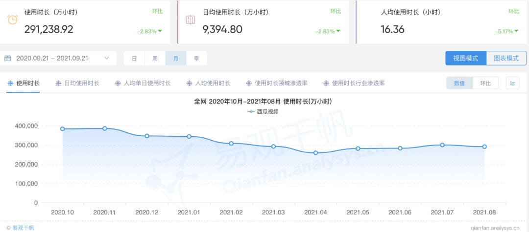 目前,西瓜视频官方未公布用户、用户使用时长等数据。但根据易观千帆数据,从西瓜视频近一年的数据来看,除了用户量,其在用户使用时长,包含日均使用时长、人均使用时长在内,以及启动次数上,均有下跌趋势。尤其是人均使用时长,由2020年10月的一个月24.89小时,到2021年8月,直降到16.36小时,降幅达34%。