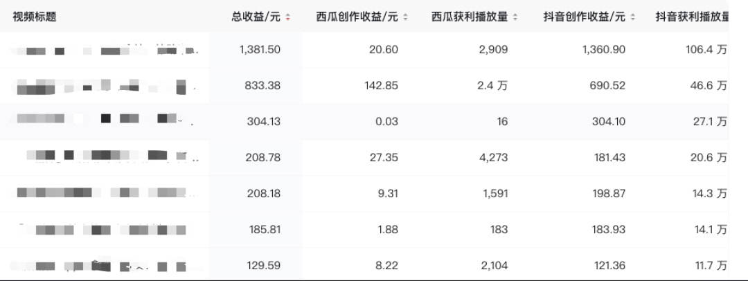但值得注意的是,尽管收益看起来不错,根据某娱乐账号向深燃提供的营收截图可以看到,其收益绝大部分是来自于抖音分成,比如收益1381元,1360元来自抖音,仅20元来自西瓜视频,来自西瓜视频的占比甚至不到1%。