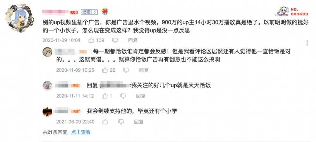 吐槽博主路温1900“恰饭”截图(图片来源bilibili)