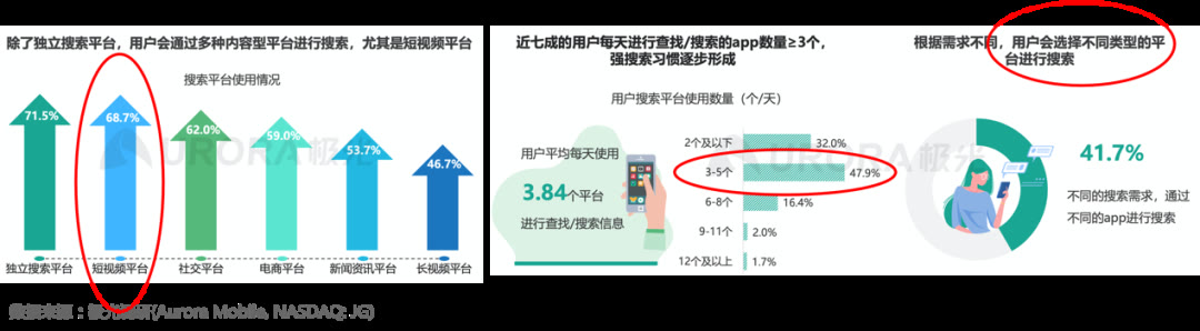 因此,我们看到了视频搜索的普及速度令人惊叹,极光发布的《内容生态搜索趋势研究报告》显示,虽然独立搜索平台以71.5%的使用率仍占第一,但视频搜索的使用率已经增长到了68.7%,排名仅次于独立搜索平台。