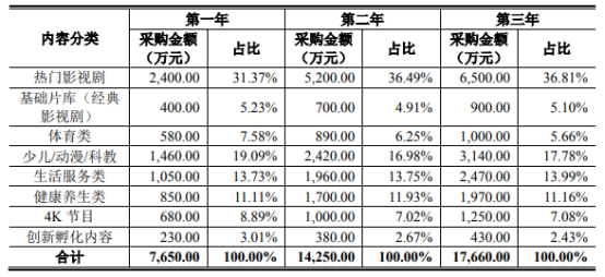 对于本次募集的资金,无线传媒拟投资39560万元用于采购版权内容,主要包括热门影视剧、基础片库(经典影视剧)、教育类、体育类、少儿/动漫、生活服务类、健康养生类、4K节目以及创新孵化内容。