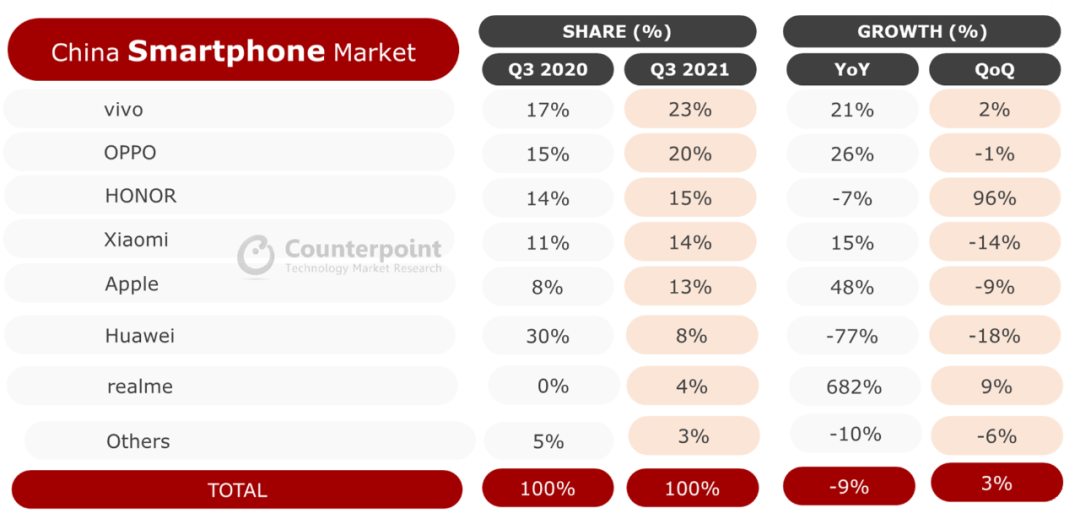 从国内整体手机市场看,Counterpoint Research发布报告所示,2021年第三季度中国市场智能手机销量同比下降9%,但环比增长3%,达到7650万部。