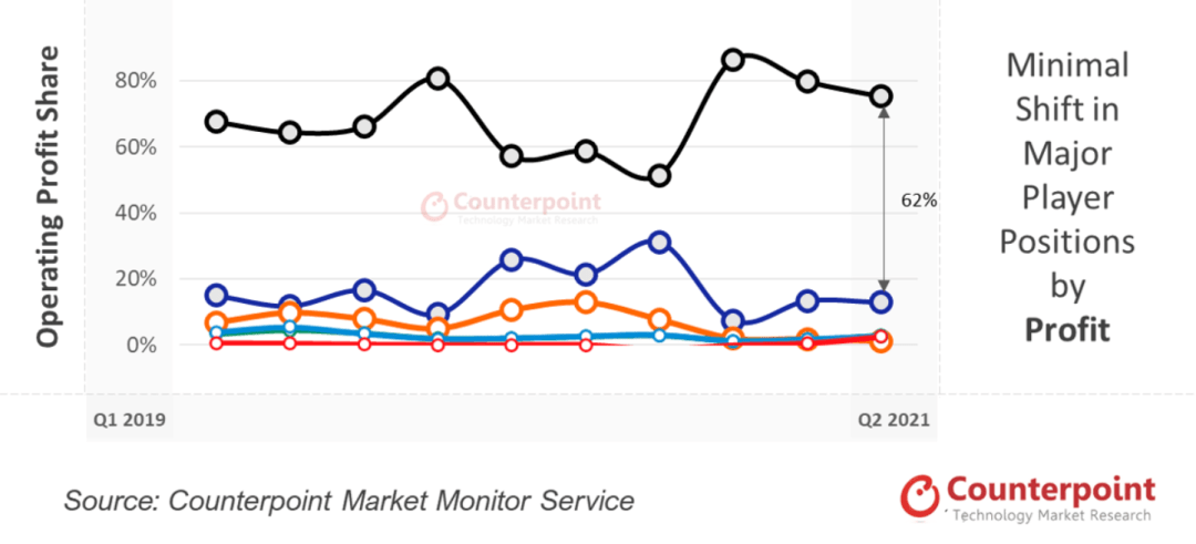 根据Counterpoint Research报告显示,二季度小米所占全球手机市场的营业利润比例还不到10%。明显的对比是,尽管苹果对全球手机出货量的贡献只有 13%,但苹果却占据了整个手机市场 75%的营业利润。