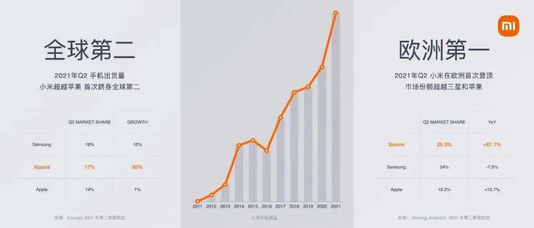 三个月前,小米的市场份额首次登顶全球第二。根据Canalys发布的第二季度全球智能手机市场份额的报告,小米市场份额为17%,智能手机销量超越了苹果,首次晋升全球第二。