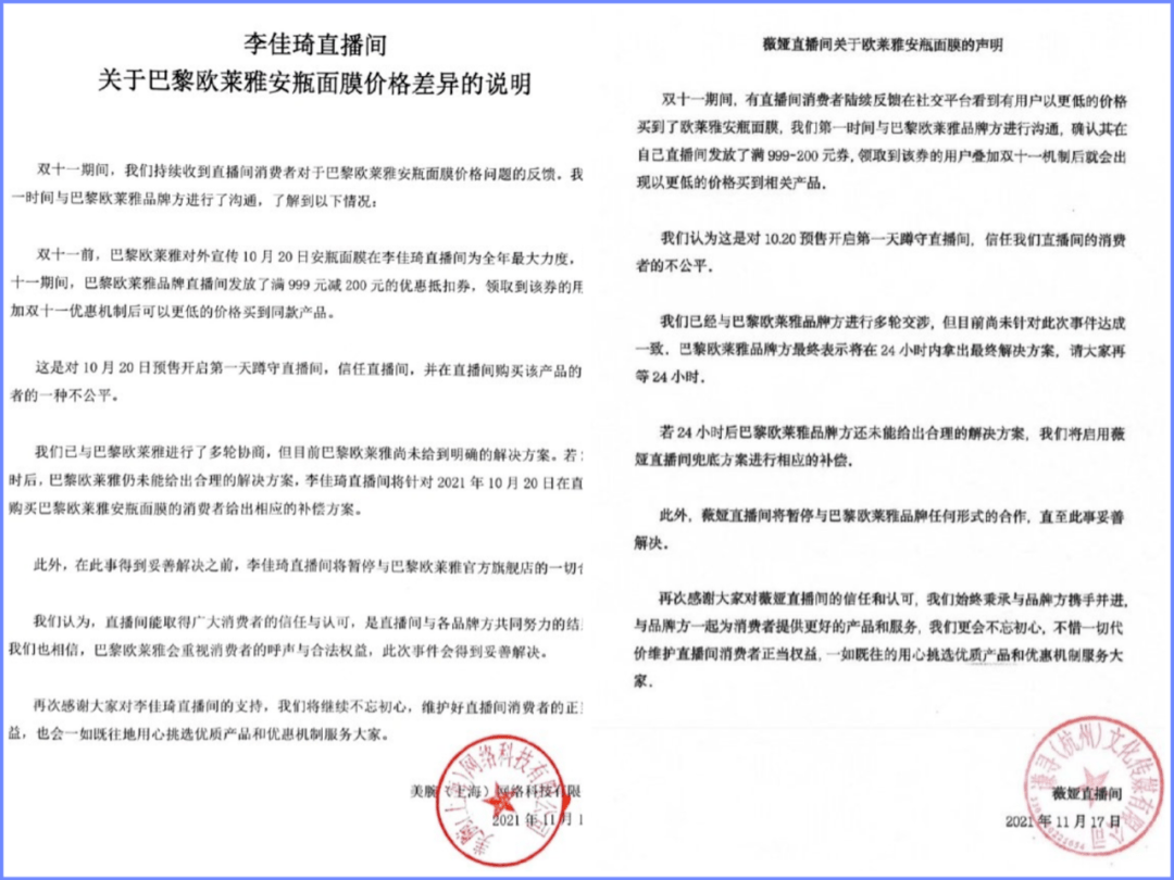 11月17号,热热闹闹的购物节过去没多久,李佳琦和薇娅就同时发布了声明,宣布暂停与巴黎欧莱雅进行合作。
