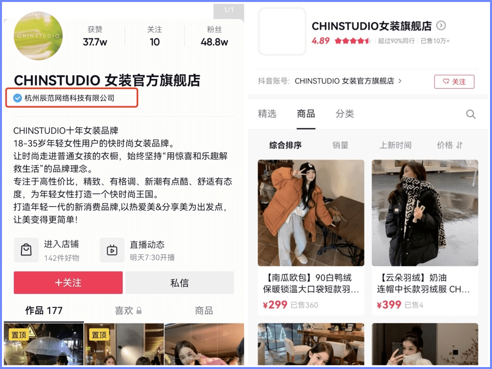 也有漏网之鱼。在抖音,雪梨疑似仍在以“CHINSTUDIO女装官方旗舰店”的账号进行商品售卖,该账号认证的杭州辰范网络科技有限公司监事为雪梨的商业合伙人钱昱帆。