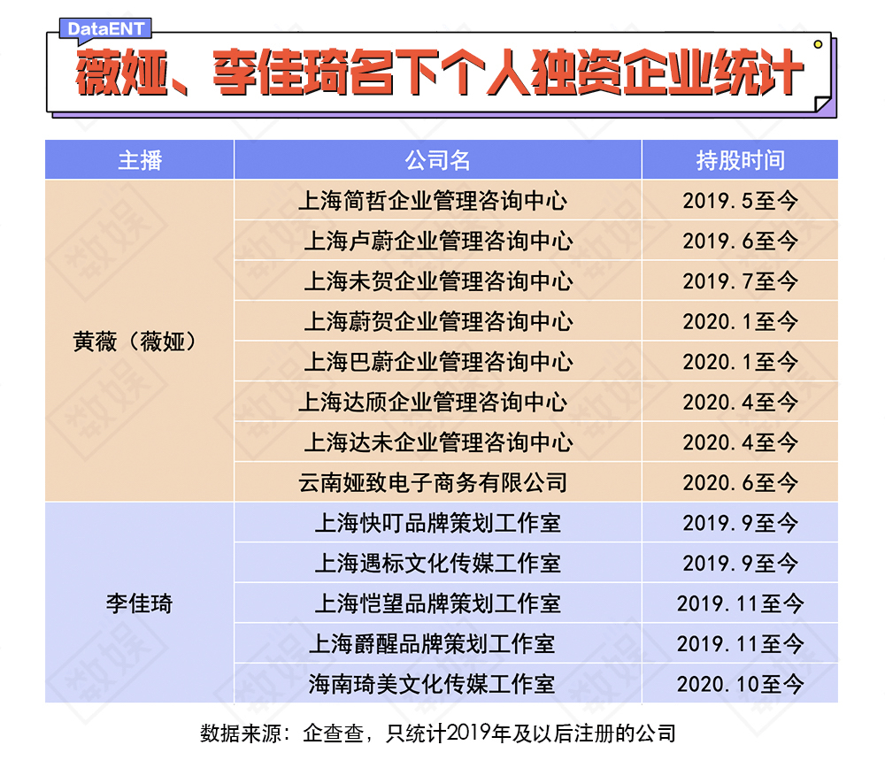 但个人独资企业在主播中并不少见。数娱君查阅发现,李佳琦和薇娅名下也有多家个人独资企业。