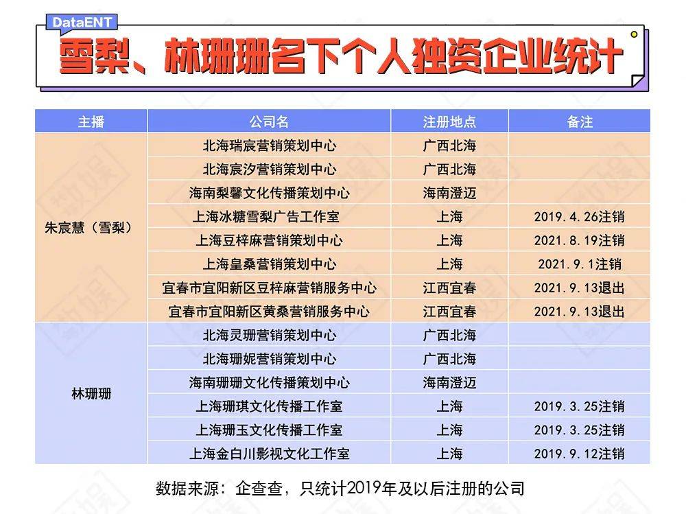 据企查查显示,自2019年起,雪梨与林珊珊名下共有14家个人独资企业,不少设立于海南、北海这样税收政策十分优惠的地区。