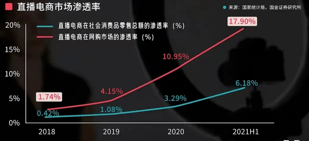 根据国金证券的研究报告显示,直播电商在电商行业的渗透率已经从2018年的1.74%飙升至了今年上半年的17.9%。截至今年,直播电商已经占据了约20%的网购市场份额。